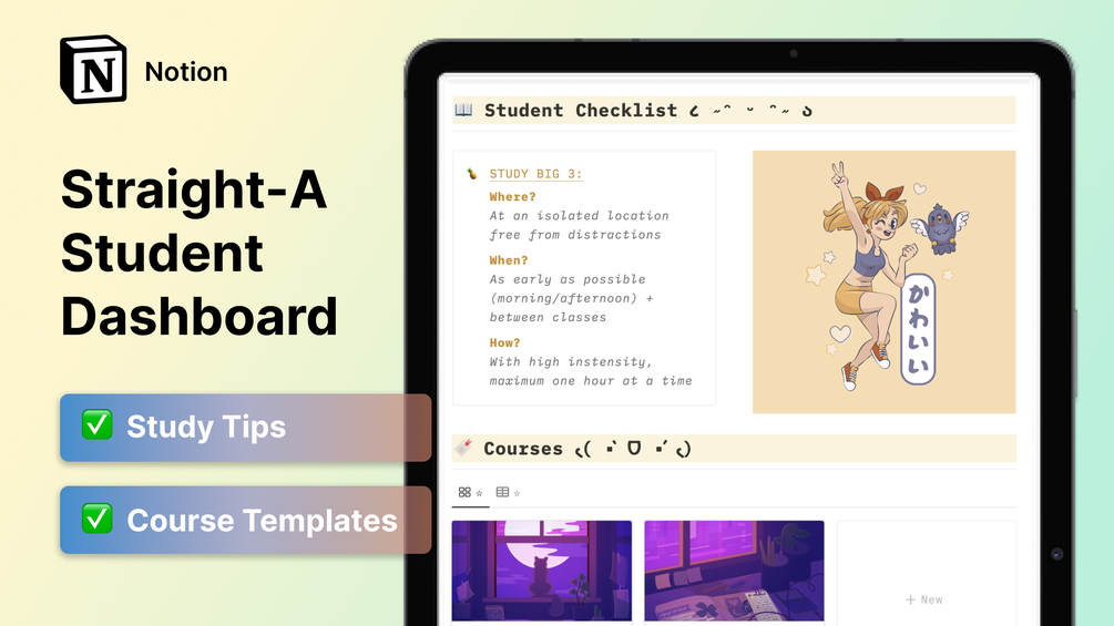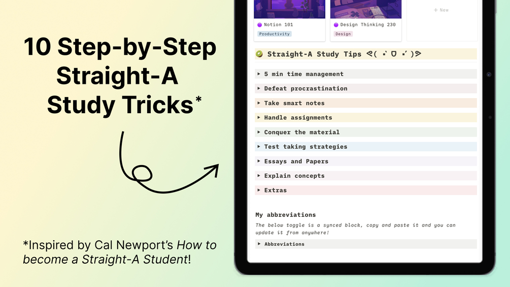 Based on insights from Straight-A students at top universities, this dashboard attempts to implement efficient study techniques in an easy-to-use Notion template.